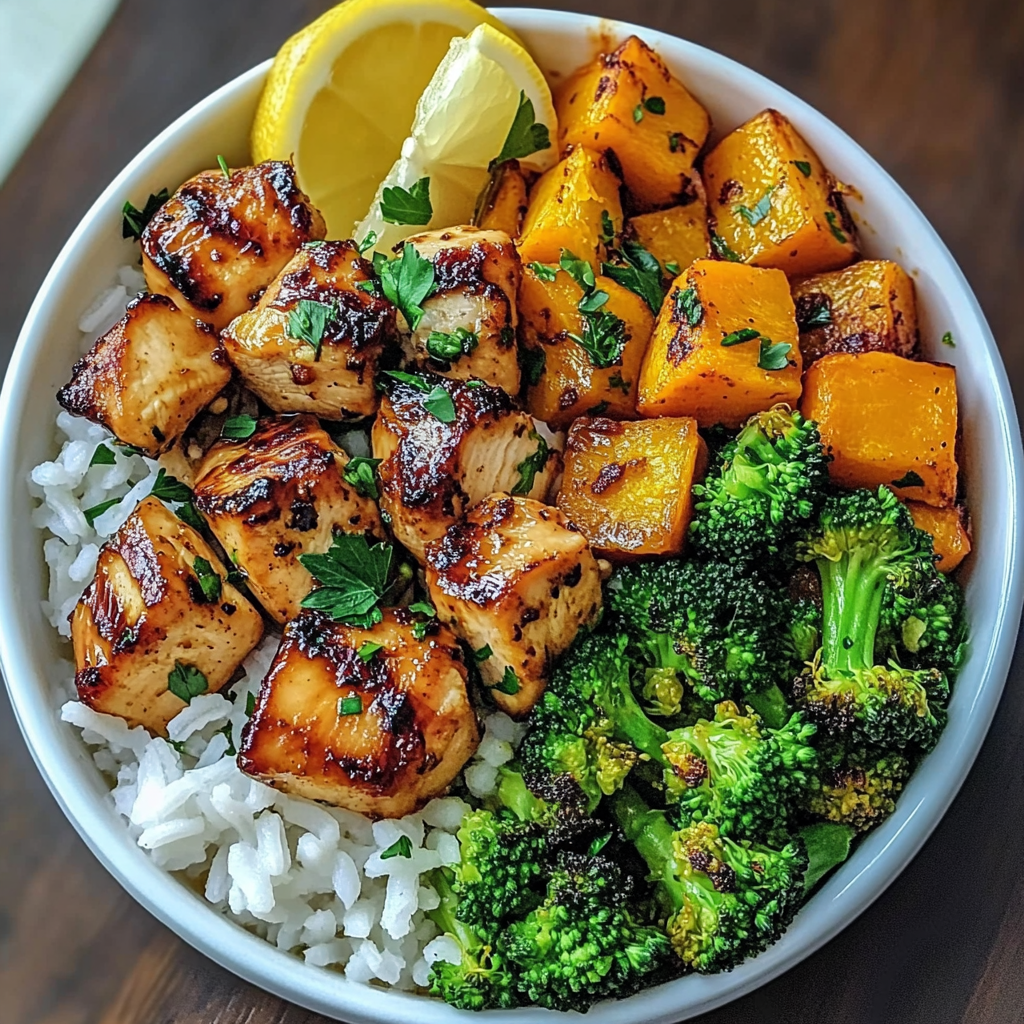 Honey Garlic Chicken Bowl with Rice, Broccoli & Roasted Butternut Squash