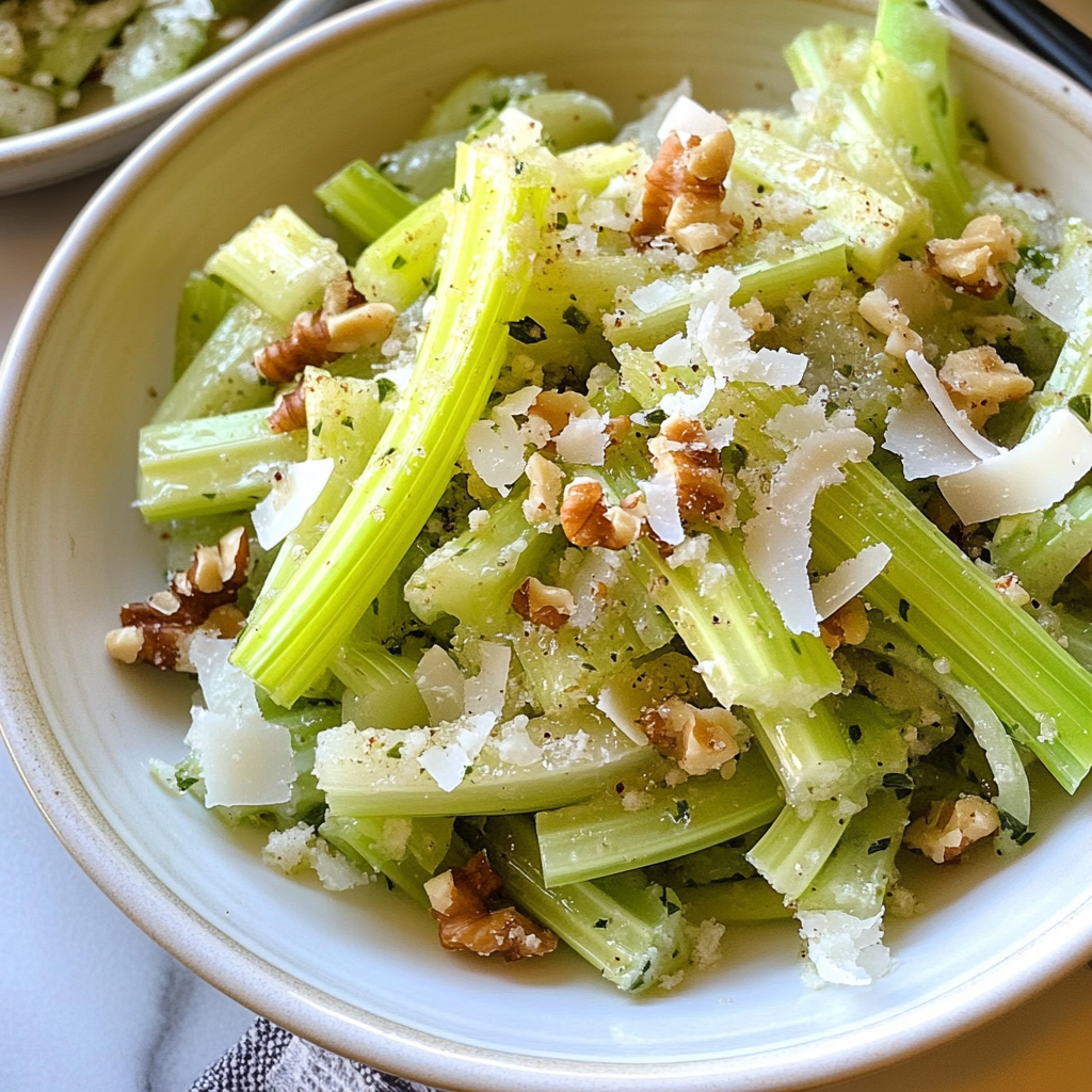 Looking for a refreshing and healthy side dish? This Celery Salad with Onions & Parmesan is a perfect choice! Bursting with crisp celery and the sweet notes of onions, this salad is elevated by the savory touch of parmesan cheese. Tossed with crunchy walnuts or pecans and drizzled with a light vinaigrette, it brings a delightful balance to your meals. Whether you’re hosting a picnic, attending a potluck, or simply enjoying a weeknight dinner, this salad is quick to prepare and incredibly versatile. It’s nutritious too, packed with vitamins and healthy fats, making it as good for your body as it is for your palate. Enjoy it fresh or let it chill in the fridge for even more flavor!