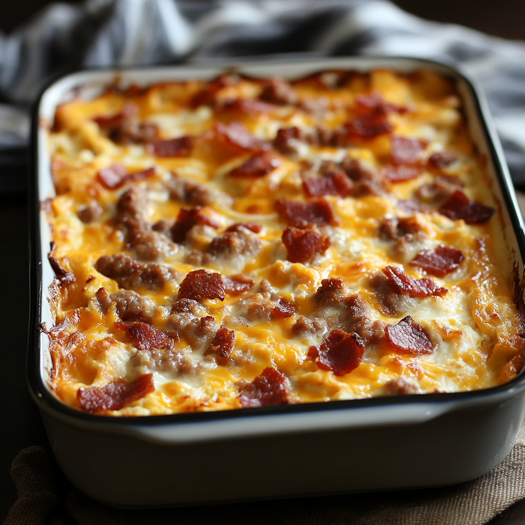 A Crack Breakfast Casserole is a savory dish made with beef sausage, turkey bacon, eggs, cheese, and hash browns, all baked together for a hearty breakfast.