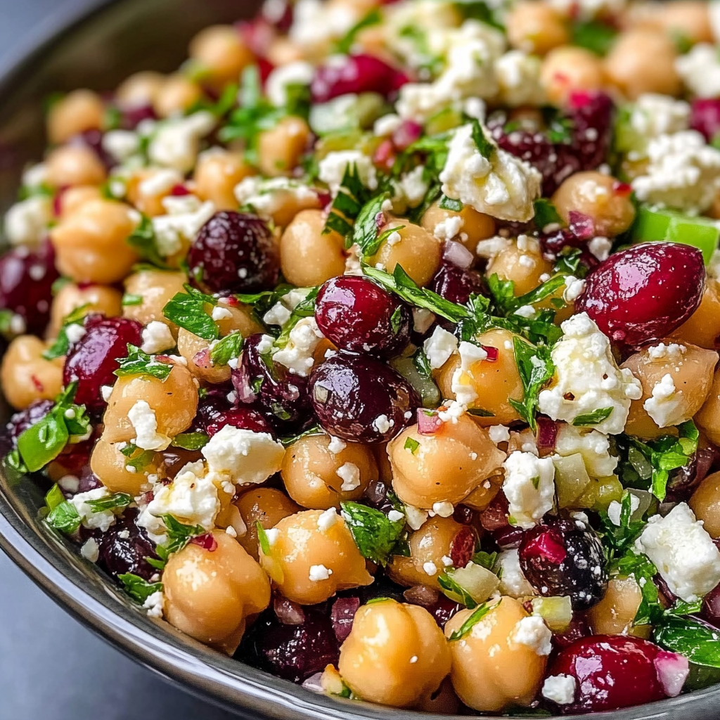 A vibrant and nutritious salad featuring chickpeas, creamy feta, and sweet cranberries, all tossed in a zesty lemon vinaigrette.