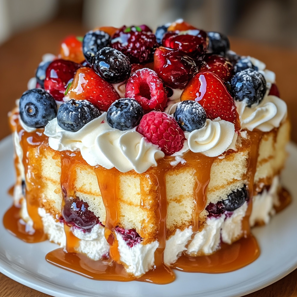- Spread whipped topping over the final layer and drizzle caramel or berry sauce on top. Garnish with extra berries and whipped cream swirls.