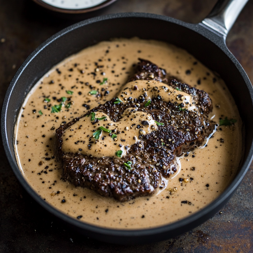Rich and smooth, featuring crushed peppercorns, beef broth, and cream for an elegant steak topping.